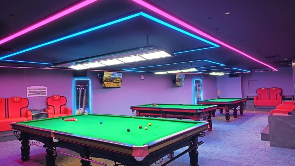 Explore the different entertainment zones designed for snooker players, gamers, and sports fans.